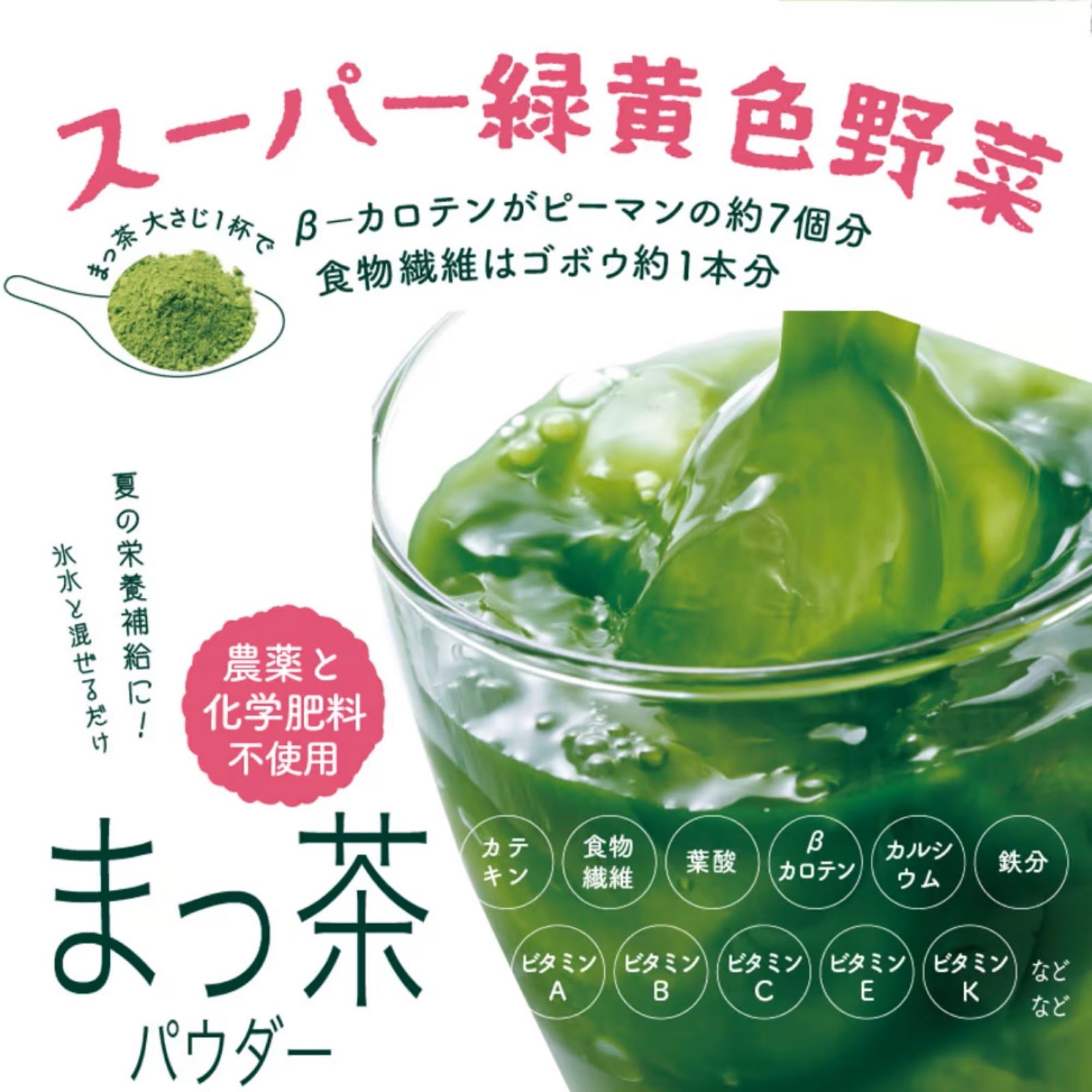 茶葉を丸ごとパウダーにした「まっ茶」は、茶葉の栄養を手軽に丸ごと摂ることができます。 濃い緑色が特徴です。