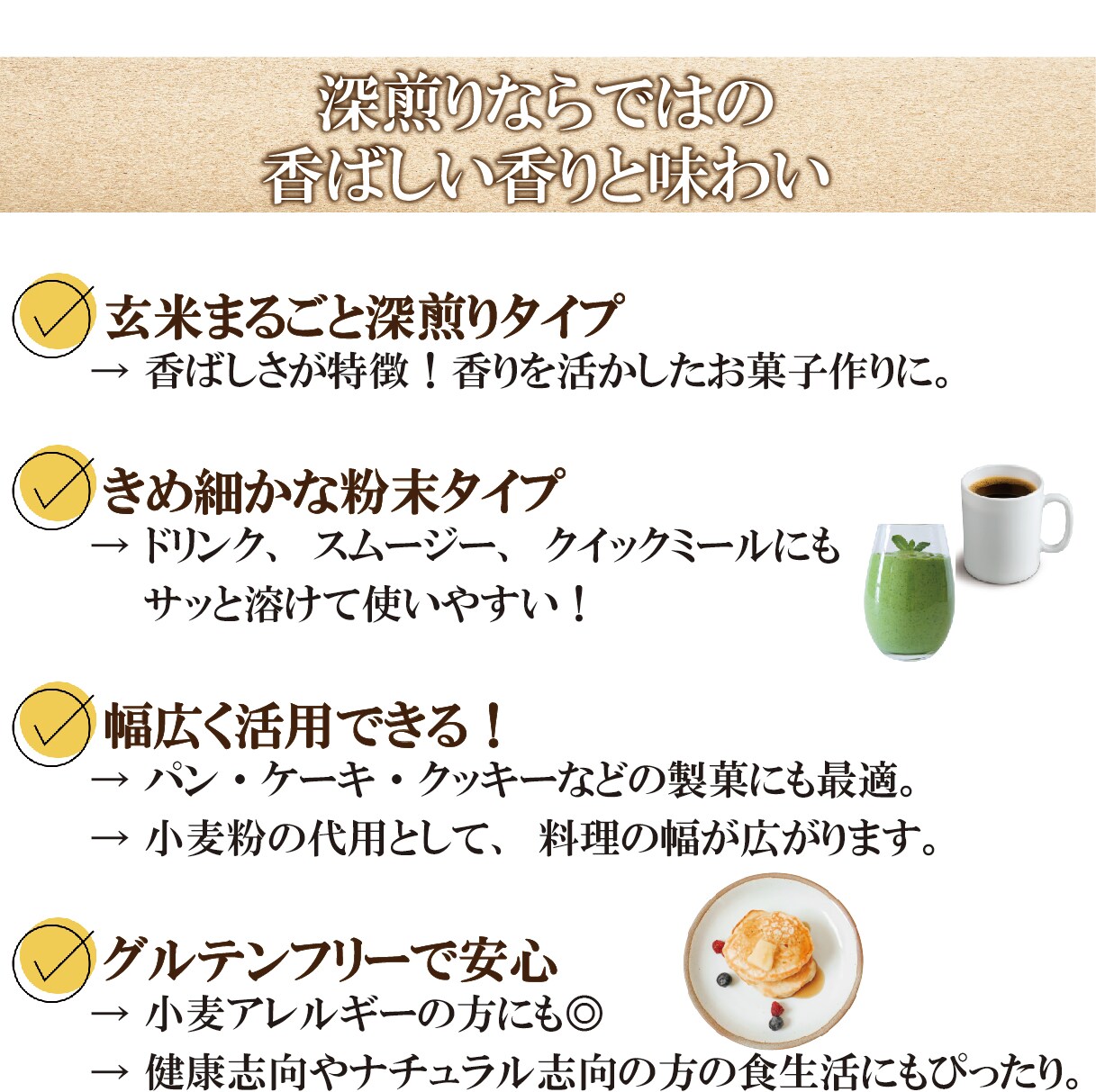 牛乳や豆乳に溶かして玄米ドリンクとして、またお菓子作りにも最適です。