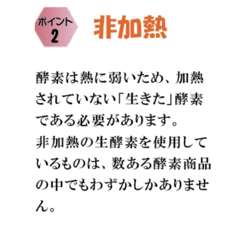 酵素は熱に弱いため、加熱されていない「生きた」酵素である必要があります。非加熱の生酵素を使用しているものは。数ある酵素商品の中でもわずかしかありません。