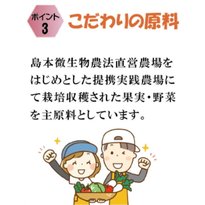 島本微生物農法直営農場をはじめとした提携実践農場にて栽培収穫された果実・野菜を主原料としています。